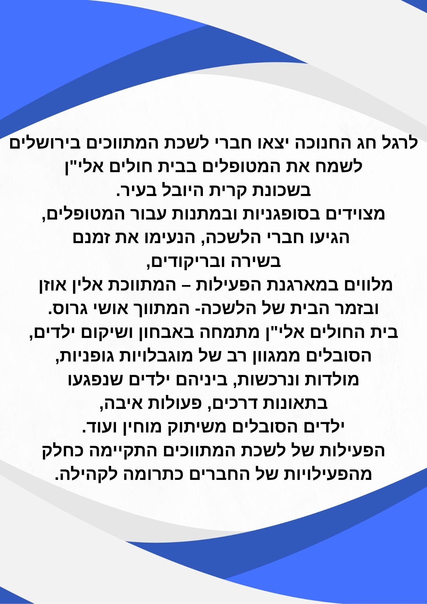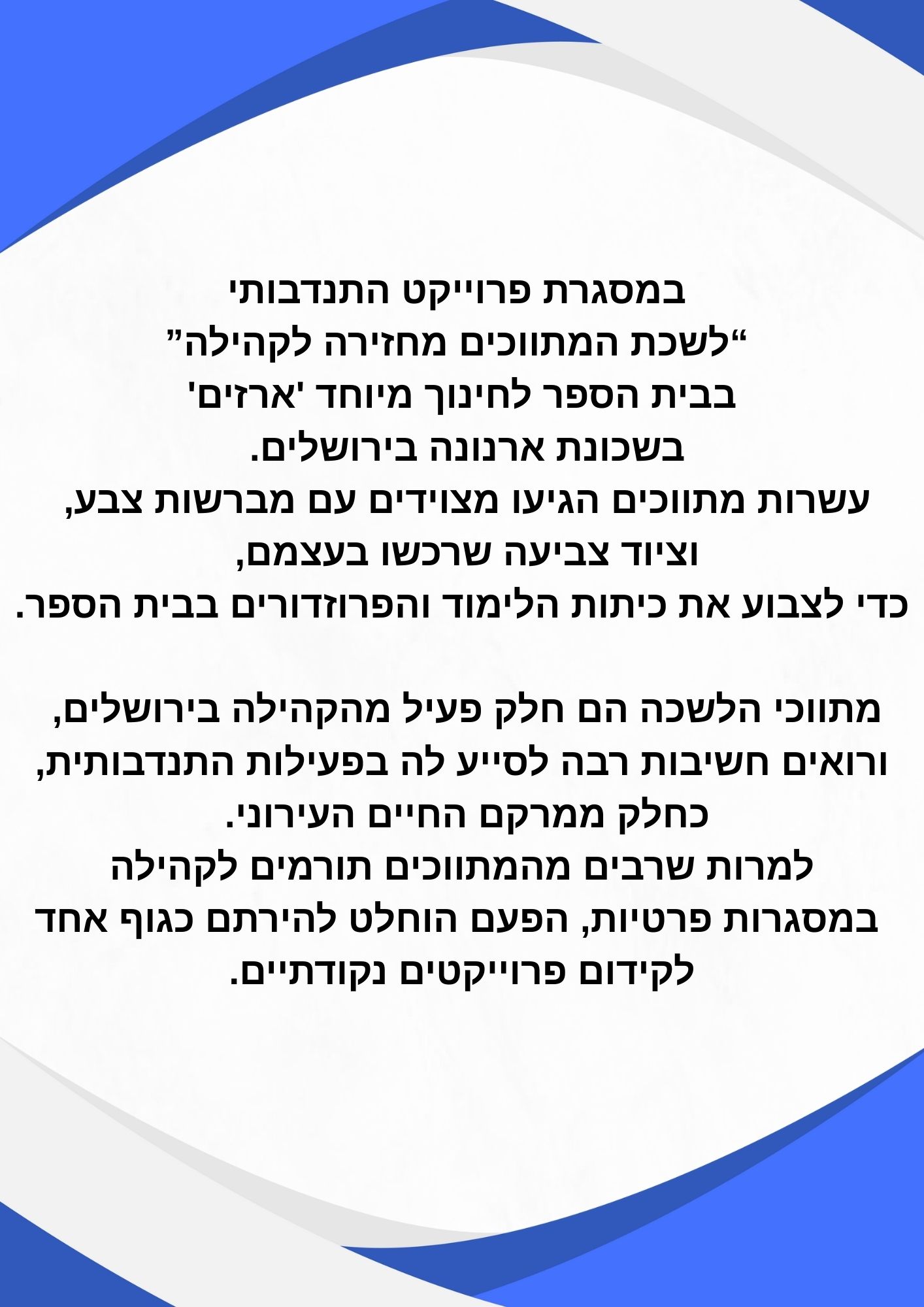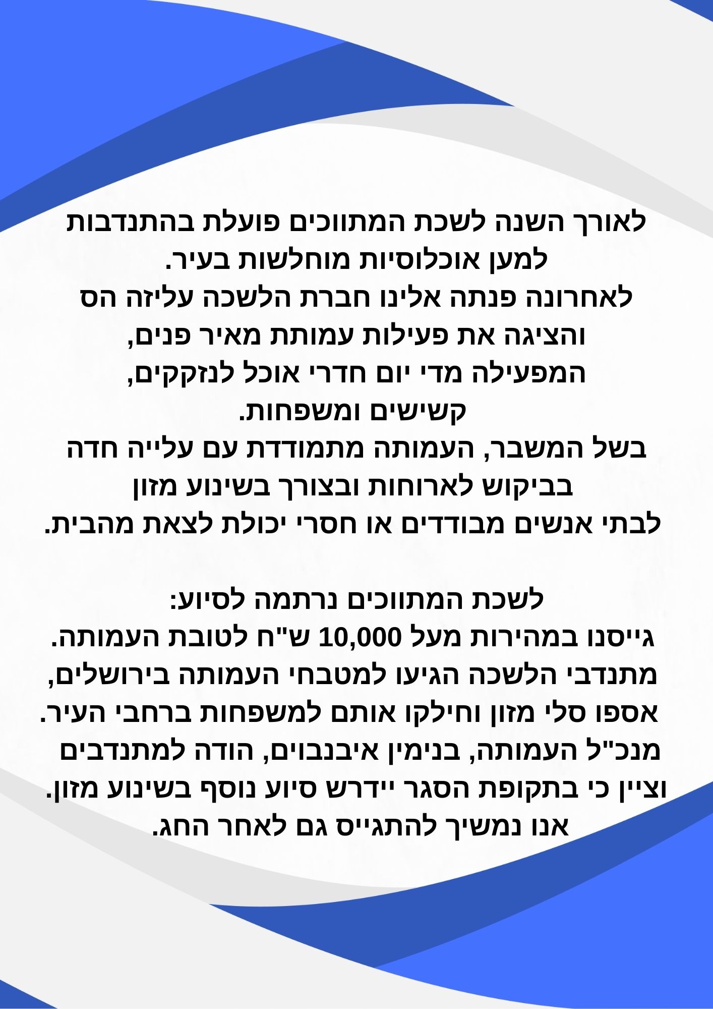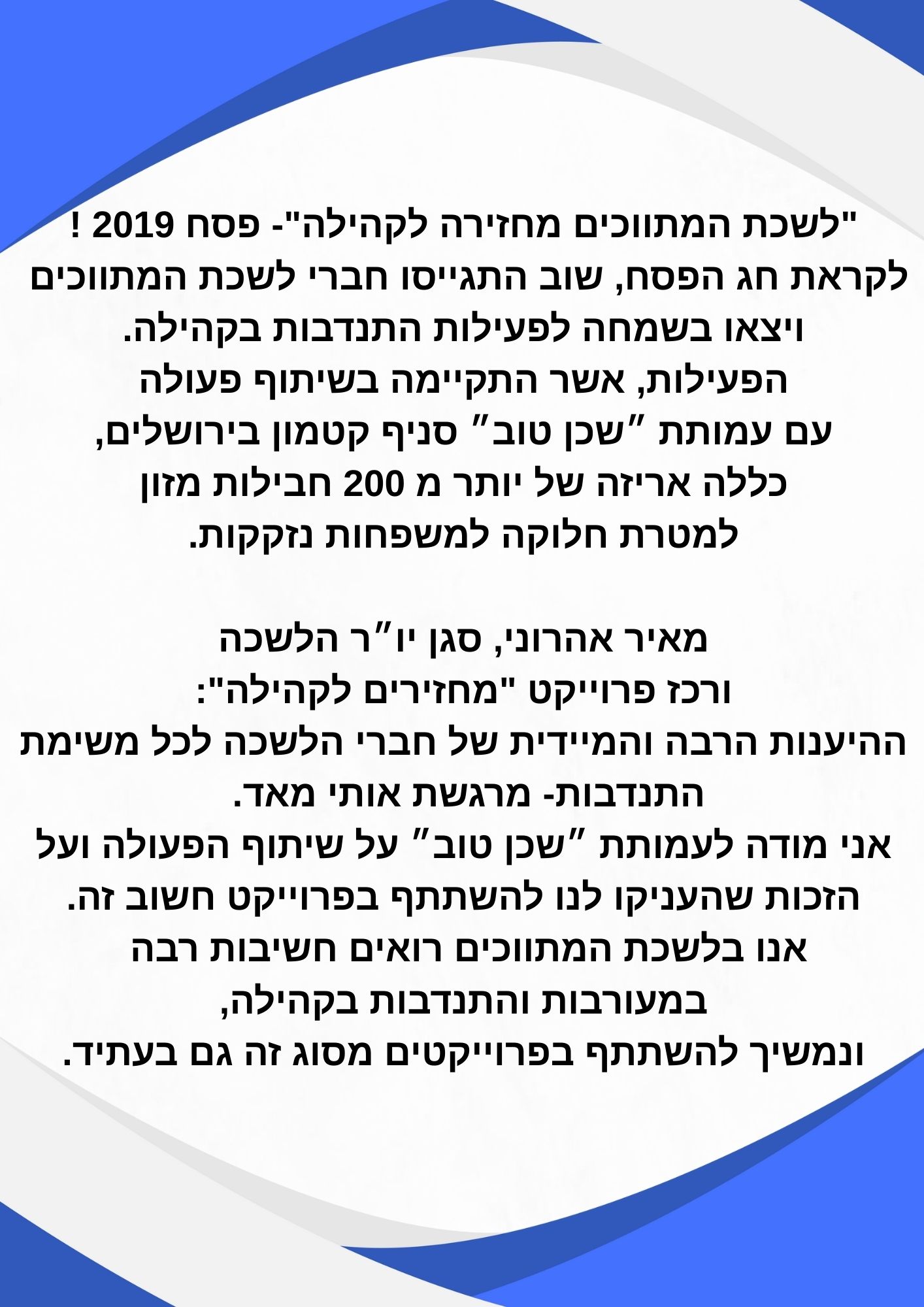 שליחת חבילות שי בשם כל חברי לשכת המתווכים בירושלים לחיילים בודדים בטקס השבעה שלהם, עם סיום המסלול (הנדסה קרבית) נשלח להם בשם חברי הלשכה שי נוסף.